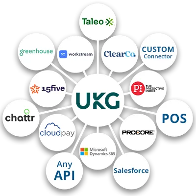 Mejore la productividad de su equipo de RRHH evitando la doble entrada de datos entre UKG y aplicaciones de RRHH como 15Five, ClearCompany, Cloudpay, Greenhouse, Microsoft Dynamics, POS, Predictive Index, Taleo, Workstream, y más.
