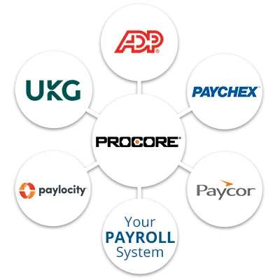 Gain seamless, hands-free integration between Procore and your payroll system, such as ADP, Paychex, Paycor, Paylocity, and UKG.